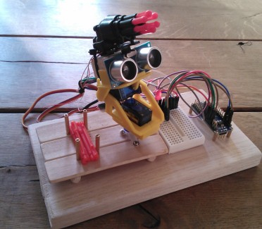 I bent the pins on the HC-SR04 90 degrees and fitted those between the Pan/Tilt thing and the wood block. I put the trestle on another piece of wood so I could put the Nano onto it along with a mini breadboard.