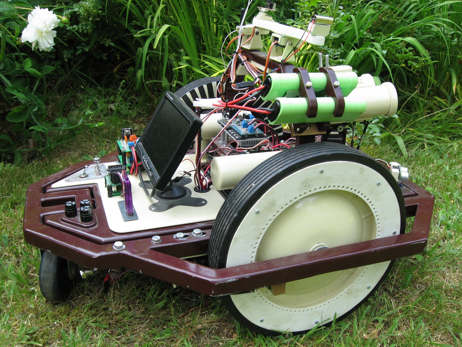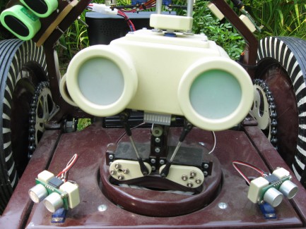 I think I will let the videos and photos speak for themselves, but to give an overview... Walter is fully custom built, I made every part including many of the PCBs. He weights about 30kg and is powered by (2) DeWalt drill motors though chain drive. I recently milled some new sprockets and added another set of gearing dropping the overall ratio by another 3:1. I am not sure of the total gear ratio, but at one time you could ride on top and he is 3 times stronger (and slower) than that now. The sprockets were made by tracing another sprocket (with a Sharpie) and simply grinding them out by hand. A 12v 12Ah SLA battery takes care of the drive power via a Dagu Wild Thumper motor controller. This same unit charges the battery as well. 2 custom made (around the MAX713 chip) onboard charges take care of the 7.2v racing packs --one supplies data power, the other does the servos. Brains consist of 2 Gadget Gangster Propeller boards, one being a slave to the other. The "main" chip takes care of the "personality", navigation, video for the monitor and keeps an eye on the wheel encoders. The second "slave" chip runs all the servos, runs predetermined "head routines", fires and sweeps the sonar, tracks the IR homing beacon with the WiiCamera and also runs the WiiCamera/Laser Lidar system. The multi-cog prop system makes chip to chip communication a breeze. Each chip has a dedicated cog that does nothing but serial watching and updates variables as new data comes in. All the other cogs have access to these variables so for example, the main navigation loop never stops to go and fire off the sonar, instead the sonar is constantly being fired in the background and variables are constantly being updated. When the navigation loop needs sonar data, it already has it. It always has it. And it always has the most recent numbers. Everything is super-duper global and with the chips talking at 115,200, it is like they are one single chip. Everything is in the background, set it and forget it. BlinkM's take care of the eyes, and a MP3 player takes care of the voice. Walter uses many different voices and sound effects, the main 2 voices being A) text to speech I dub from online and B) a good buddy of my in London who records lines for me and emails them. So far, he has recorded over 200 words and phrases for Walter. I try to send him "batches" of lines to do so until I have a "batch" big enough to send, the text-to-speech voice is used. There is also a speech recognition system onboard as well but I just can't seem to find the time to do anything with it. Soon. Overall, Walter is the sum of about 2 1/2 years work, a couple/few thousand dollars (all spent in nickles and dimes) and a lot of lost hair. I would say he is about 1/2 way to where I would like him to be.