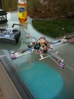 Although this project is marked complete, as we all know are they ever really complete?? Anyway I again used the arduino UNO as my microcontroller as I really love their products..I have also used the SparkFun 9DoF sensorstick for the gyros,accelerometer, and magnetometer.. I used the FreeIMU code to read the sensorstick and produce a filtered yaw/pitch/roll angles.. They really did a great job and I didn't feel the need to attempt to reinvent the wheel on that as I have already done some filtering code on my balancing robot.. From there I really ran into trouble with the reciever code so I borrowed that from the BaronPilot project.. Other than that the rest was mine(although I admit they took care of all the really complicated stuff.. hehehe).. I will spend some more time tuning the PID parameters and also I still have to implement the yaw sensor, apart from that I may add a barometer sensor or maybe a ultrasonic sensor for altitude but that would likely be it for this one...