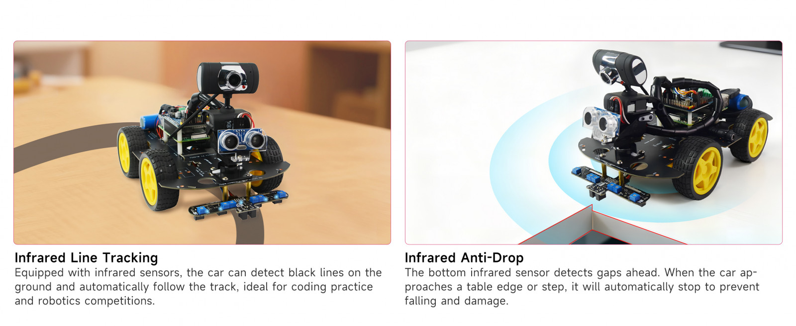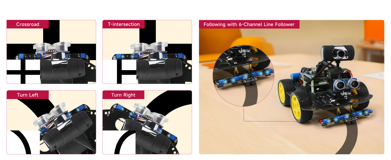 This module is equipped with 6 infrared probes, which can more accurately identify path features, such as straight lines,curves,cross-road,T-intersection and other complex routes.