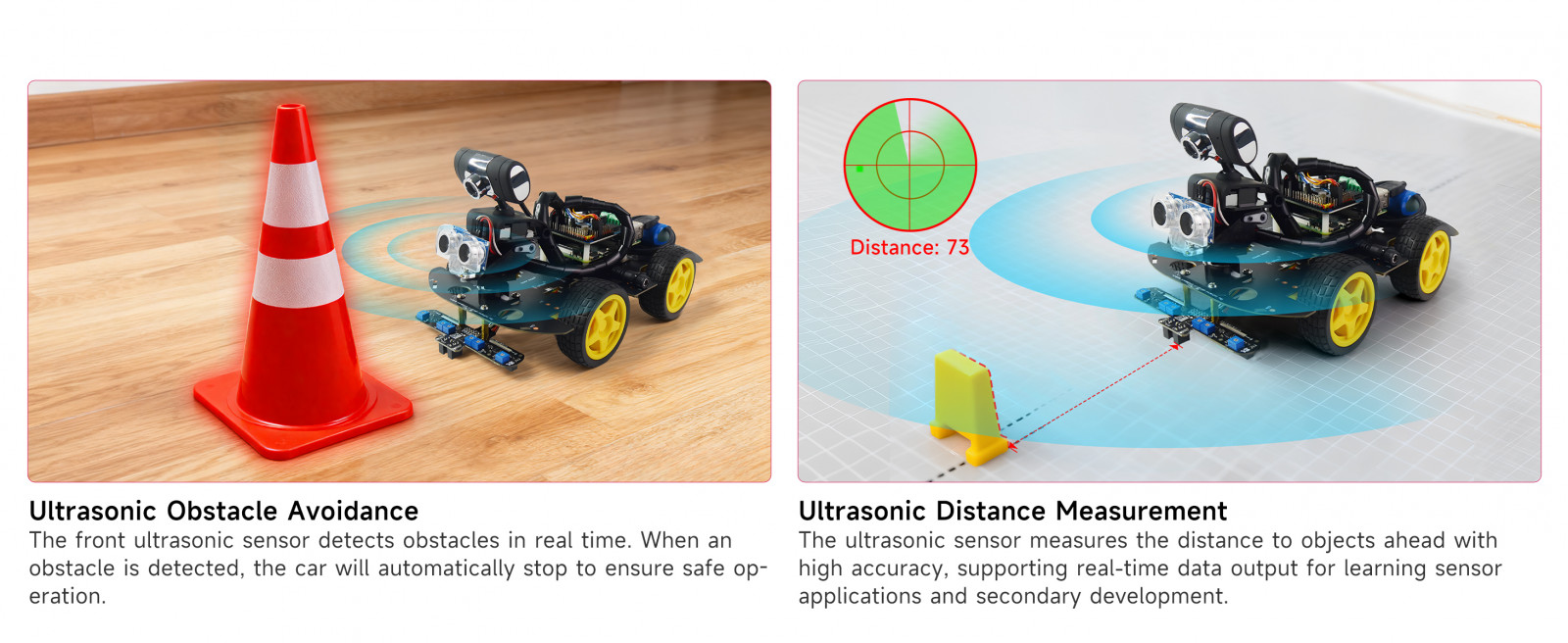 The ultrasonic module can realize the functions of ultrasonic obstacle avoidance, ultrasonic ranging, and ultrasonic maze walking.
