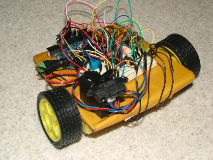 now finaly after about 40 trys (including the ones when batterys were empty when i didn't noticed) my robot can turn to right and left, move back and forward combined with a IR sharp distance sensor and a servo LMR got itself an other object avoiding robot.