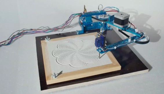 Inspired from Bruce Shapiro and his 'Sisyphus' (http://www.taomc.com) i saw in a ehebition, i add to my ZENrobot a sand bed and a ball pen refill with a micro servo for the Z axis. Because i dident now about GCode at this time i had written the arduino code by myself. And the communication between processing and arduino is slow. Each step is done the arduino gives a feedback and processing can calculate the next (sub)step. 2day i would use GCode. Done in a smal version with 2 old CDROM sliders.