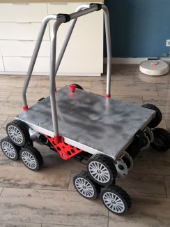 The history of this robot began with the fact that I bought a house on a hillside. Everything was great until I had to carry weights up and down the stairs. My patience snapped when I rented a two-wheeled soil loosening machine and couldn't get it up the stairs. I realized that not only I have such a problem, but also hundreds of thousands of people like me. For example, all my neighbors suffer from this problem. It is very annoying when small or larger obstacles cause large financial and physical costs. I realized that I need an all-terrain robot that I can use to lift and lower loads up and down stairs, a lawn mower, a lawn watering robot, a snow sweeper in winter, an assistant with tools for manual work, a robot for independent shopping in the market and just a small truck. I had two options for solving the problem. The first option is a robot with four stairs wheels. And the second option is a robot copter. I would like to show the first version of the all-terrain vehicle robot. This is not a final version, a pre-production version that I tested. A copter robot is also being created, but unlike the original idea, it also turns into a device of near-Earth flights with possibility to reach moon and return back to the Earth.